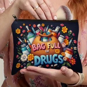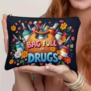 • Design: Humorous “Bag Full of Drugs” Text, Vibrant Floral & Pharmacy Graphics