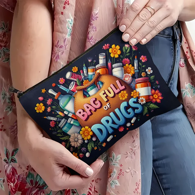 🌈 Vibrant “Bag Full of Drugs” Cosmetic Bag | Quirky Floral & Pharmacy Design Gift